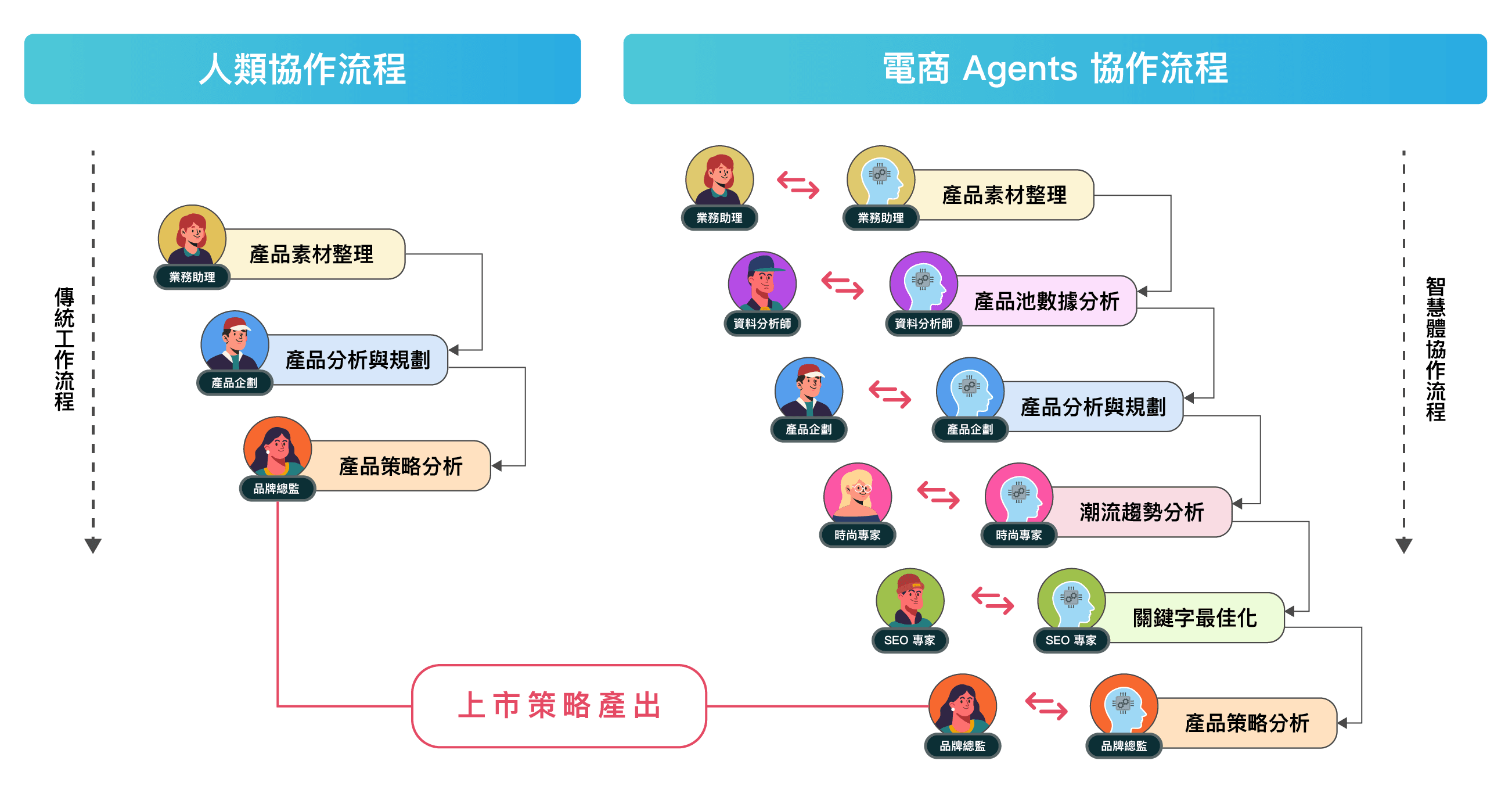 以電商產業為例,透過模擬⼈類職位專業與協作的流程,並增加其他不同專業⾓⾊,讓最終⽣成的結果快速⼜專業。